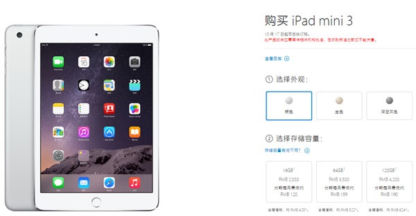 苹果发布了史上最薄的平板电脑iPad Air 2,并推出增加了TouchID的iPad mini 3,目前苹果中国官网商城显示从10月17日起可以订购。iPad Air 2售价为16GB 3588元;64GB 4288元;128GB 4988元。iPad mini 3售价为16GB 2888元;64GB 3588元;128GB 4288元。目前两款产品都仅有WIFI版本可选择,有银、金、灰三种颜色。