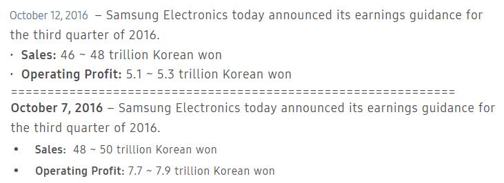 三星电子上周(10月7日)公布了第三季度财报预期,受停售和停产Note 7的影响,三星10月12日又重新更新了第三季度财报预期。