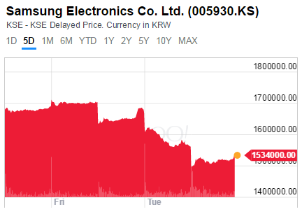 受Note 7停售和停产消息的影响,三星股价近几日表现低迷,尤其是昨日(10月11日)跌幅超过8%。