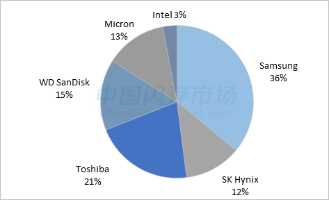由于2D NAND制程瓶颈的凸显,3D NAND技术已成为NAND Flash发展的重要转折点,同时也是各家Flash原厂稳固NAND Flash市场地位的关键。据中国闪存市场ChinaFlashMarket数据,2016年三星NAND Flash市场市占率为36%,东芝21%,SK海力士12%,WD SanDisk 15%,美光13%,英特尔3%。