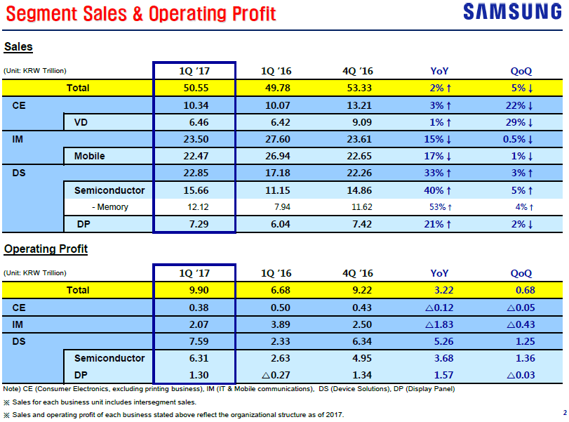 三星公布了截止至3月31日的2017年第一季度(1-3月)财报数据,总营收为50.55兆韩元(约合447亿美元),同比增长1.6%,环比下滑5.2%,营业利润达9.9兆韩元(约合87.6亿美元),同比增长48%,环比增长7.4%,净利润7.68兆韩元(约合67.9亿美元),同比增长46%,环比增长8.4%。