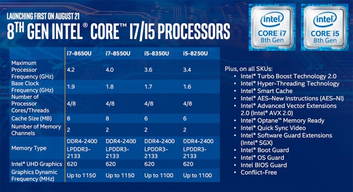 英特尔正式揭开了8代酷睿处理器产品线的面纱,涵盖了 Y、U、H、以及 S 系列。其中四款处理器的详细规格已曝光,包括 i7-8650U、i7-8550U、i5-8350U、以及 i5-8250U,它们均为桌面级 4 核 / 8 线程设计,支持双通道 DDR4-2400 或 LPDDR3-2133 内存,且集成 Intel 620 UHD Graphics 核显。