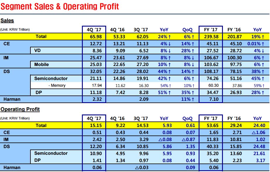 IT和移动通信部门(IM)第四季度营收25.47兆韩元(约合238亿美元),同比增长8%,营业利润2.42兆韩元(约合22.6亿美元),同比下滑3.2%,因为营销成本上涨。虽然受季节性需求减弱的影响,三星第四季度智能型手机出货较上一季度下滑,但高端旗舰产品(如Galaxy Note 8)的出货量则有所增加。2018年Q1,三星移动业务将通过提高Galaxy S9销售量来提高盈利。