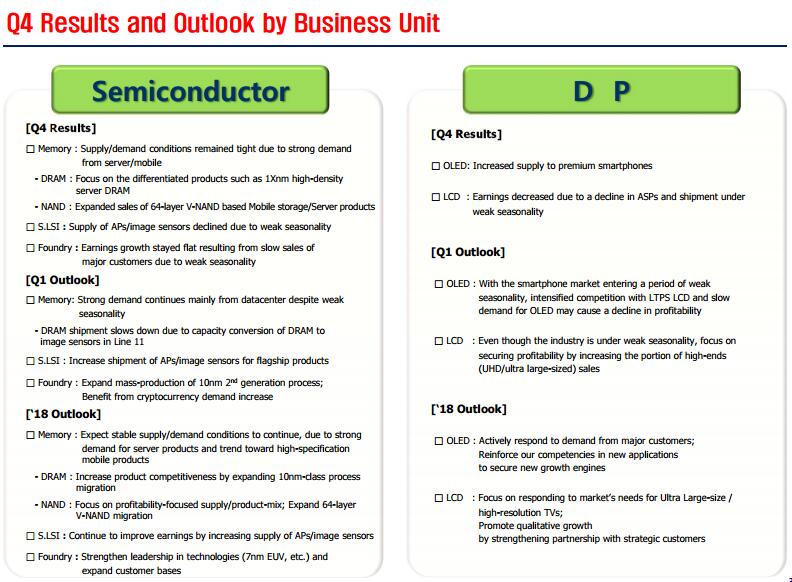显示面板业务第四季度营收11.18兆韩元(约合104.6亿美元),营业利润1.41兆韩元(约合13.19亿美元)。用于高端智能手机的OLED面板出货量增加,但由于季节性需求减弱,LCD面板的利润下降,从而抑制了销售和ASP。2018年前三个月,显示面板业务可能面临的挑战,如LTPS LCD厂商竞争加剧以及季节性需求疲软等。