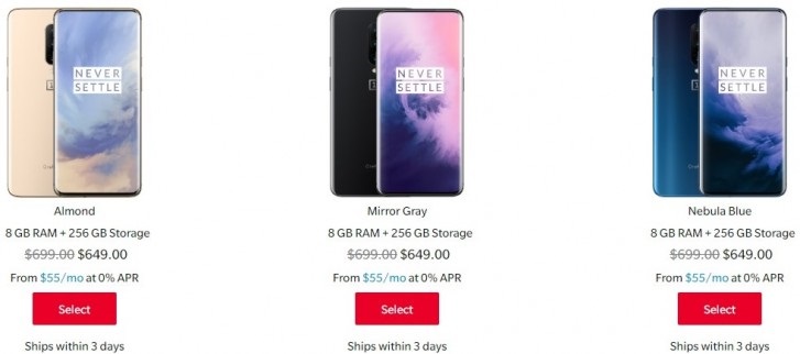 一加7 Pro的基本型号和顶配型号已从美国官方网站上删除,美国用户只能购买8GB内存型号,该颜色有镜面灰色、杏仁色和星云蓝色。