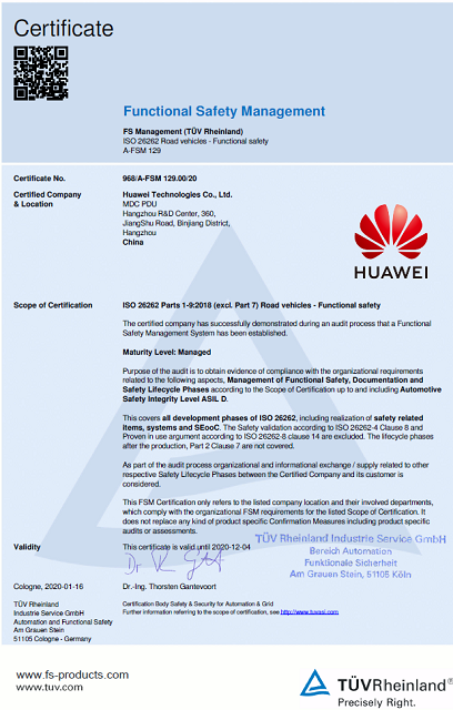 近日,华为MDC智能驾驶计算平台获德国莱茵TÜV集团(以下简称“TÜV莱茵”)颁发ISO 26262功能安全管理认证证书。ISO 26262汽车功能安全标准是国际标准化组织于2011年制定的一项全球性标准,并于2018年12月正式发布其最新版本。该标准涵盖功能性安全需求规划、设计、实施、集成、验证、确认和配置等方面,旨在通过完善的开发流程,将汽车电气或电子系统故障的风险降到最低,是全球电子零部件供应商进入汽车行业的准入门槛之一。