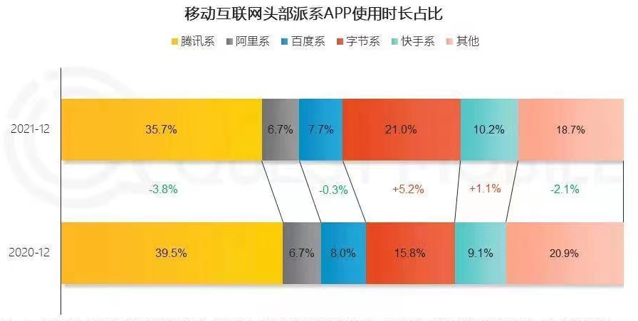 据QuestMobile的12月数据显示,按头部企业派系划分,腾讯系使用时长被短视频挤压,较2020年12月同比下滑3.8%,使用时长从39.5%下滑到35.7%。代表短视频的字节系及快手系使用时长占比则合计从24.9%增长至31.2%,其中,字节系仅次于腾讯系总时长占比达21%。
