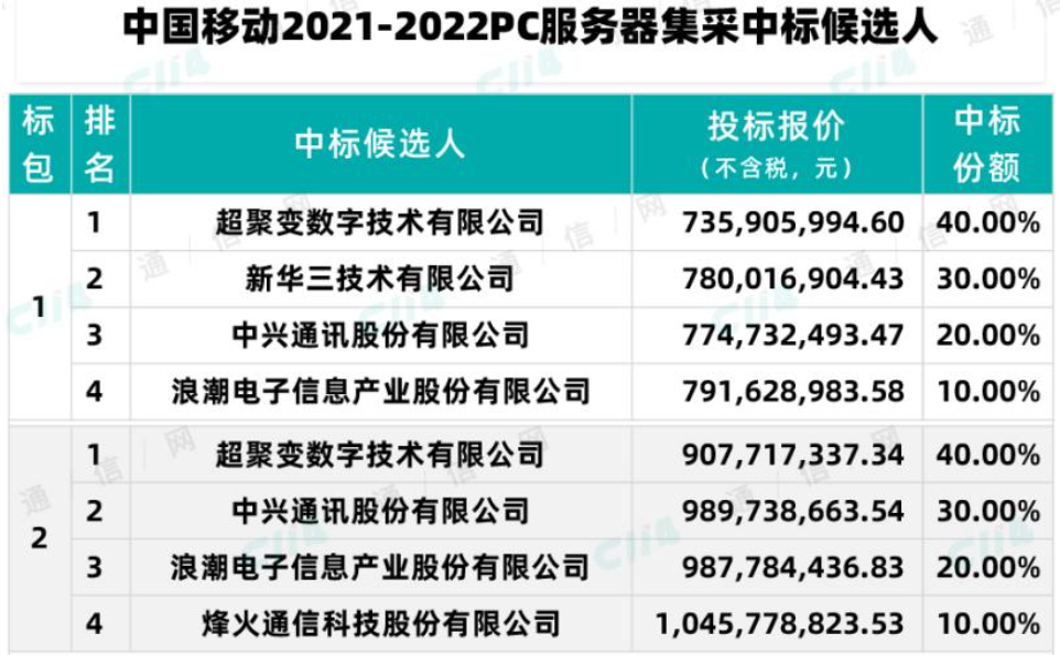 据媒体报道,近日,中国移动公示了2021-2022年第一批PC服务器集采项目标包16的中标结果。