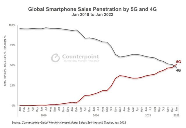 据Counterpoint报告显示,2022年1月全球5G智能手机的销售渗透率达到51%,首次超过4G智能手机的渗透率。
