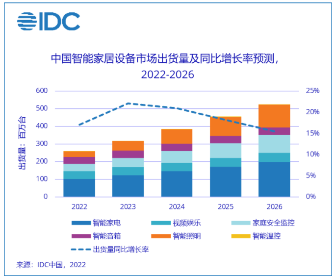 报告显示,随着供需双方压力逐渐缓解,以及市场升级优化,预计2022年中国智能家居设备市场出货量将突破2.6亿台,同比增长17.1%。