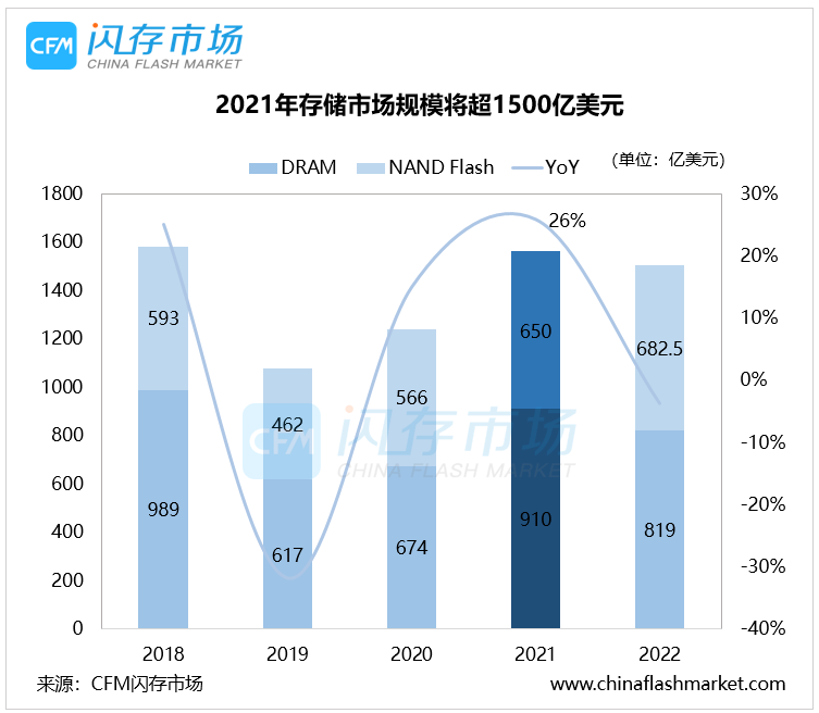 在当前云计算、大数据、人工智能等前沿科技不断发展的背景下,数据存储需求将呈爆发式增长,根据闪存市场CFM数据,2021年全球存储市场规模超过1500亿美元,相较2020年增长26%。