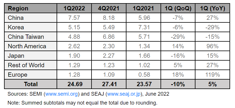 据SEMI发布的全球半导体设备市场报告显示,2022年第一季度全球半导体设备出货金额同比增长5%,达到247亿美元。由于季节性疲软,第一季度出货金额季度环比下降10%。