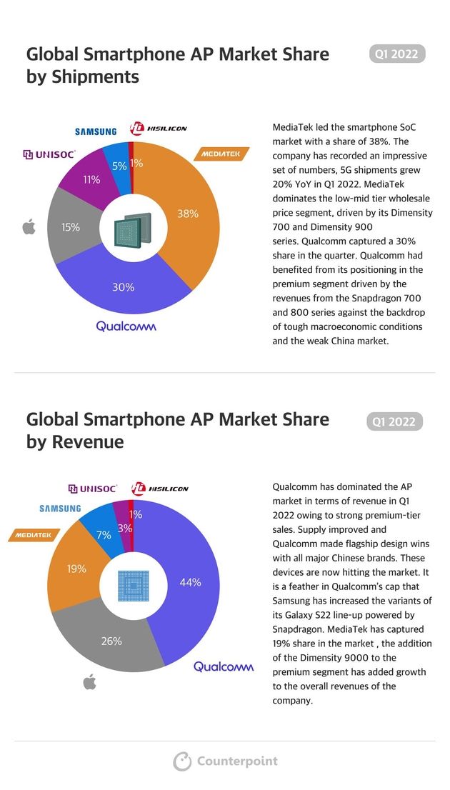 据Counterpoint Research公布的最新智能手机芯片市场报告显示,2022年第一季度全球智能手机芯片收入高通占44%,联发占19%;2022年第一季度全球智能手机芯片出货量联发科占38%,高通占30%。