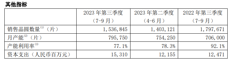 其他指标方面,三季度内晶圆销售数量153.7万片,环比增长9.53%,同比下滑14.5%;月产能79.6万片,环比增长5.57%,同比增长12.75%;产能利用率77.1%;资本支出1531万人民币。