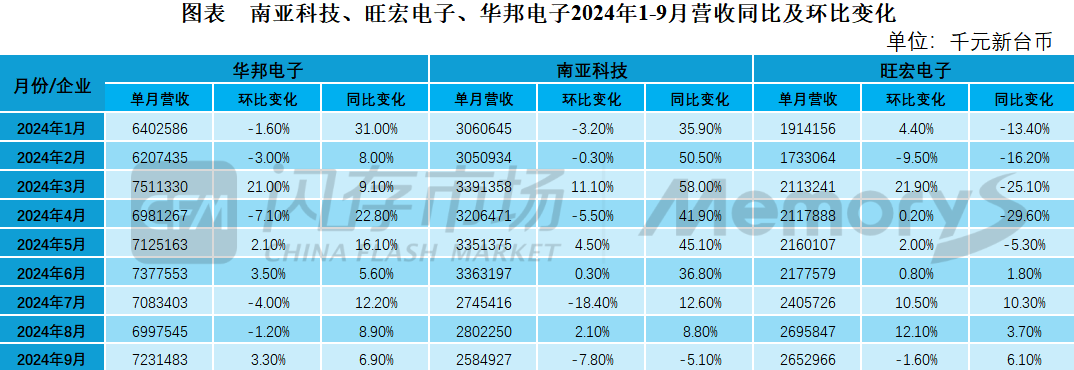 值得注意的是,华邦电子继7月、8月营收环比均录得负增长之后,9月实现回正,且为2024年第三高,但同比增幅较前两季有所收敛。而南亚科技9月营收自今年以来首次出现同比下滑,单月营收创近13个月新低,不过前9月营收累计同比增幅达30%。旺宏电子营收同比实现四连增,而环比则打破了此前连续六个月的稳步上扬趋势出现小幅下跌。