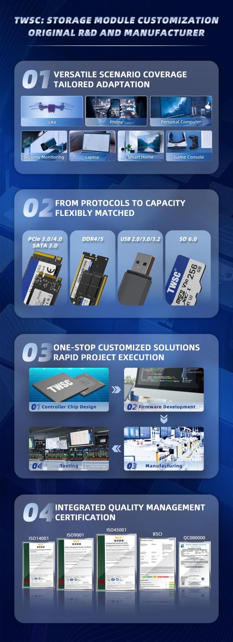 全栈定制服务为无人机、智能终端等七大领域提供兼具高可靠性、协议兼容性、高能效比的定制化存储方案,将技术优势转化为高性能存储方案的全球化竞争力,助力客户在快速变化市场中的应变能力和业务连续性。