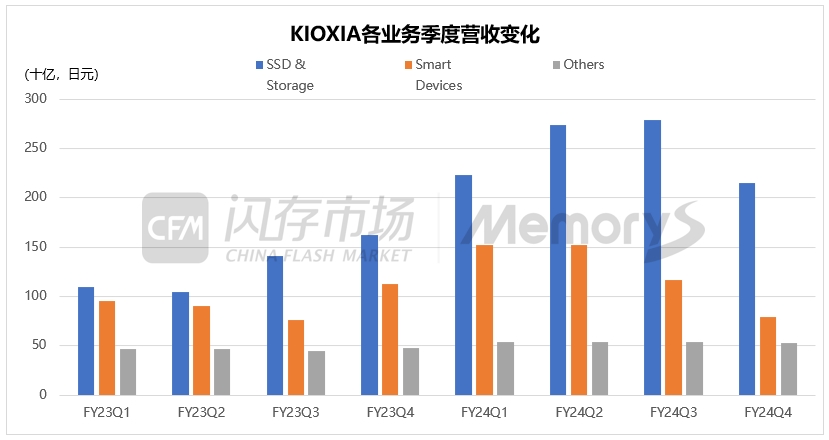 SSD和存储业务:营收2152亿日元,环比减少23%;其中,数据中心/企业业营收占比为60%,PC及其他业务营收占比40%。