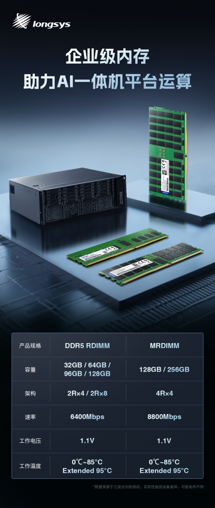 面对算力平台的高速运算需求,数据的完整性和可用性至关重要,这要求存储系统必须具备高容量以及卓越的RAS(可靠性、可用性和可维护性)特性,以确保系统的稳定运行和数据的精准处理。江波龙近期推出了支持单条容量高达128GB的DDR5 RDIMM和128GB/256GB的MRDIMM,能够为单台AI算力一体机构建出4~6TB的庞大运算内存容量。