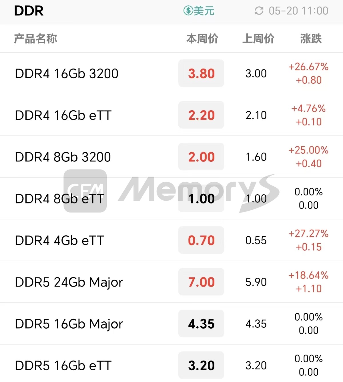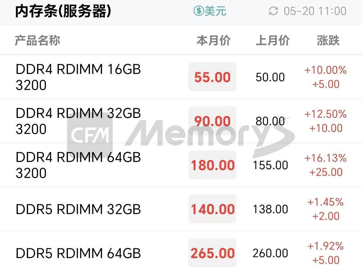 鉴于存储原厂相继发布DDR4 EOL通知,近期现货DDR4价格剧烈波动,为更好地反映市场情况,CFM闪存市场于5月20日加更服务器RDIMM价格,最新价格如下:
