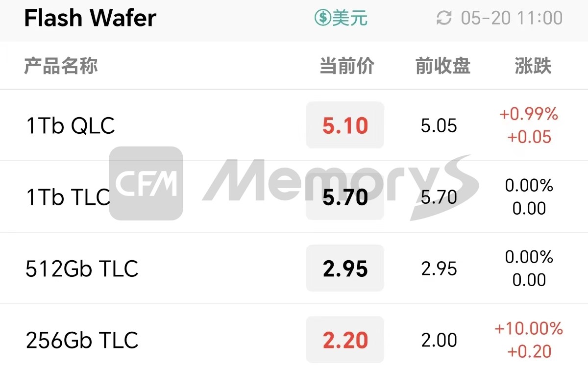 今日,部分Flash Wafer和DDR资源价格继续报涨,其中,1Tb QLC/256Gb TLC Flash Wafer价格调涨至5.10/2.20美元,DDR5 24Gb Major、DDR4 16Gb 3200/16Gb eTT/8Gb 3200/4Gb eTT分别上涨至7.00/3.80/2.20/2.00/0.70美元。
