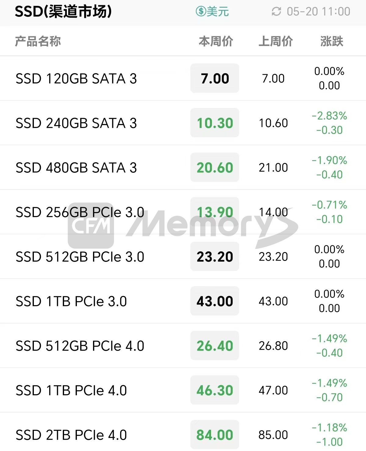 渠道品牌客户陆续开启618大促活动,国补叠加平台优惠下部分电子产品价格直降,但从终端反馈来看,实际销量未达预期。而渠道客户现有库存仍足以支撑其短时间销售,虽关税大松绑下市场观望情绪有所缓解,少数渠道客户陆续恢复询单却普遍保持谨慎,加上部分渠道存储厂商低价出货搅动市场,渠道SSD价格承压,部分产品转而下跌。