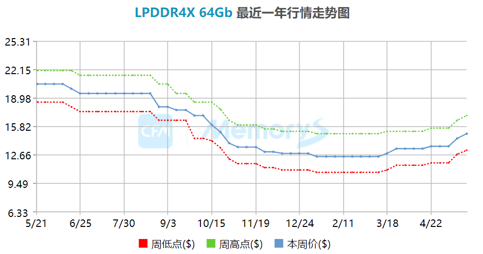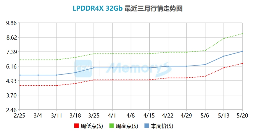 除DDR4外,适用于手机等移动终端的LPDDR4X产品也受原厂产能收缩影响供应相对不足,本月以来LPDDR4X产品现货价格被迅速抬高。其中,16Gb/32Gb/48Gb LPDDR4X均大幅涨超20%。
