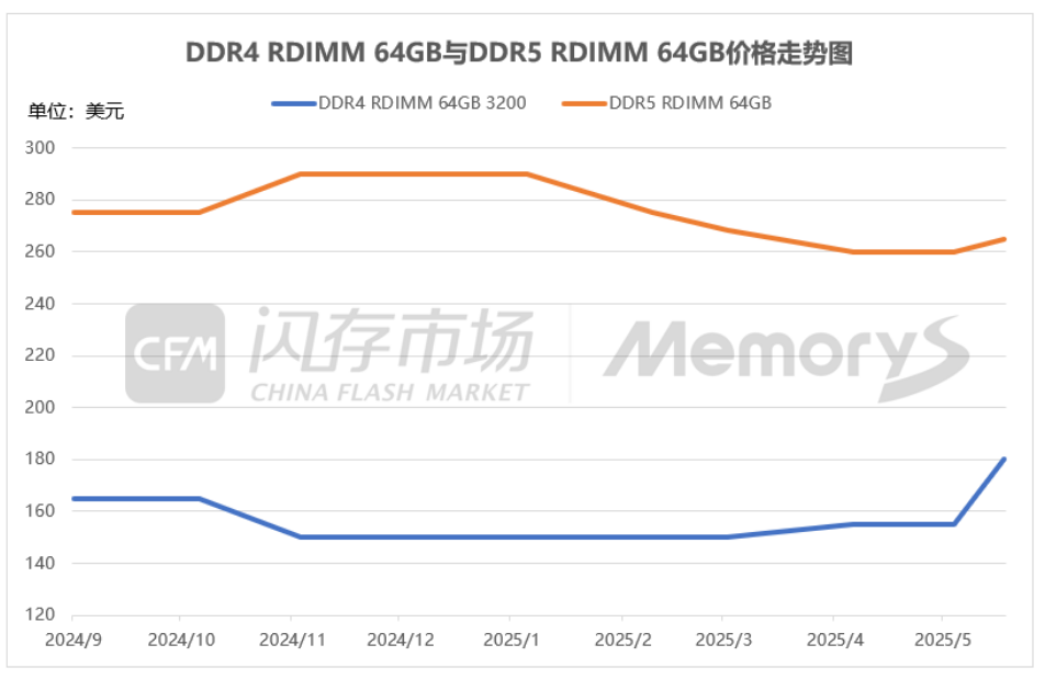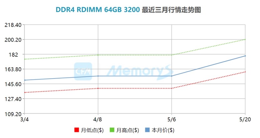 基于此,本周CFM闪存市场加更服务器内存条RDIMM报价,以服务器 64GB DDR4内存条为例,在4月至5月的短短一个多月时间内,其价格已从一季度末的13X美元左右低点攀升至超过180美元,与此同时,由于短期需求激增,供应已无法得到更好的满足,部分报价甚至突破190美元。