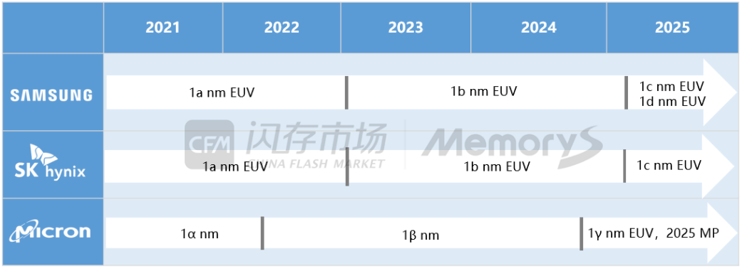 而今年以来,原厂继续保持收缩1x/1y等旧制程DRAM产能态度,部分原厂DDR4产能占比降至约10%,并将资本支出更多分配至利润更高的DDR5和HBM等先进制程产品上,专注于继续扩大先进HBM、1a/1b DRAM制程产能,以满足AI服务器市场需求,预计今年1c/1γ DRAM也将进入生产阶段。下图为各家原厂DRAM技术发展情况: