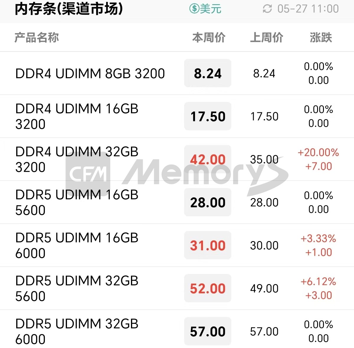 渠道市场内存条最新报价