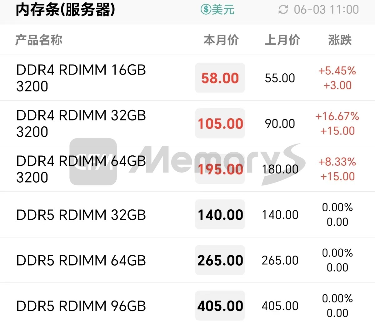 行业市场内存条最新报价