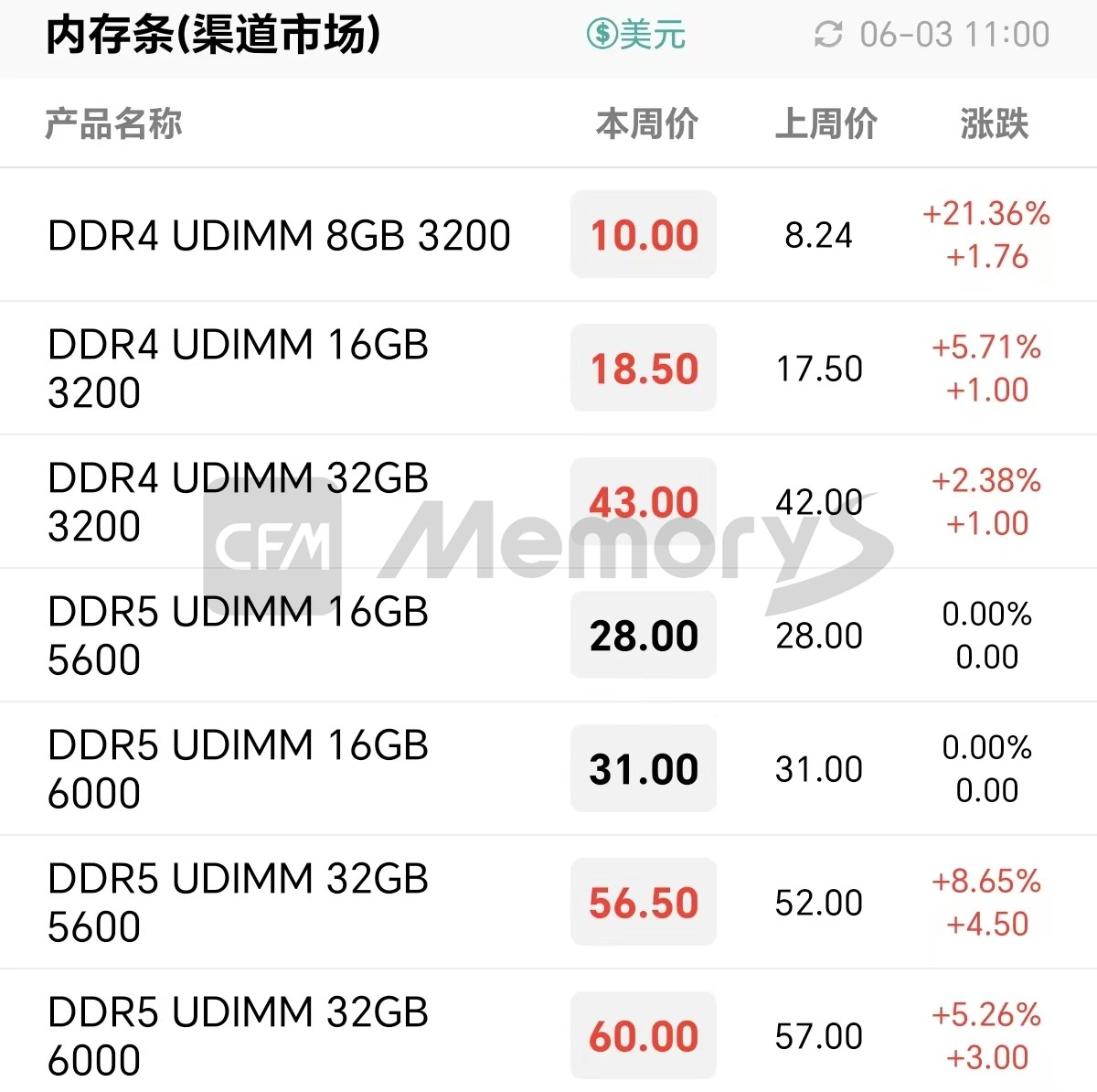 本月以来,部分现货DDR4颗粒急涨令贸易端炒作氛围浓重,在涨价环境烘托下渠道低端资源现货贸易价格也在缓慢拉涨,近日其价格更是直线拉涨近10%。而渠道存储厂商拉涨内存条价格态度不改,本周多数渠道DDR4、DDR5调涨报价。