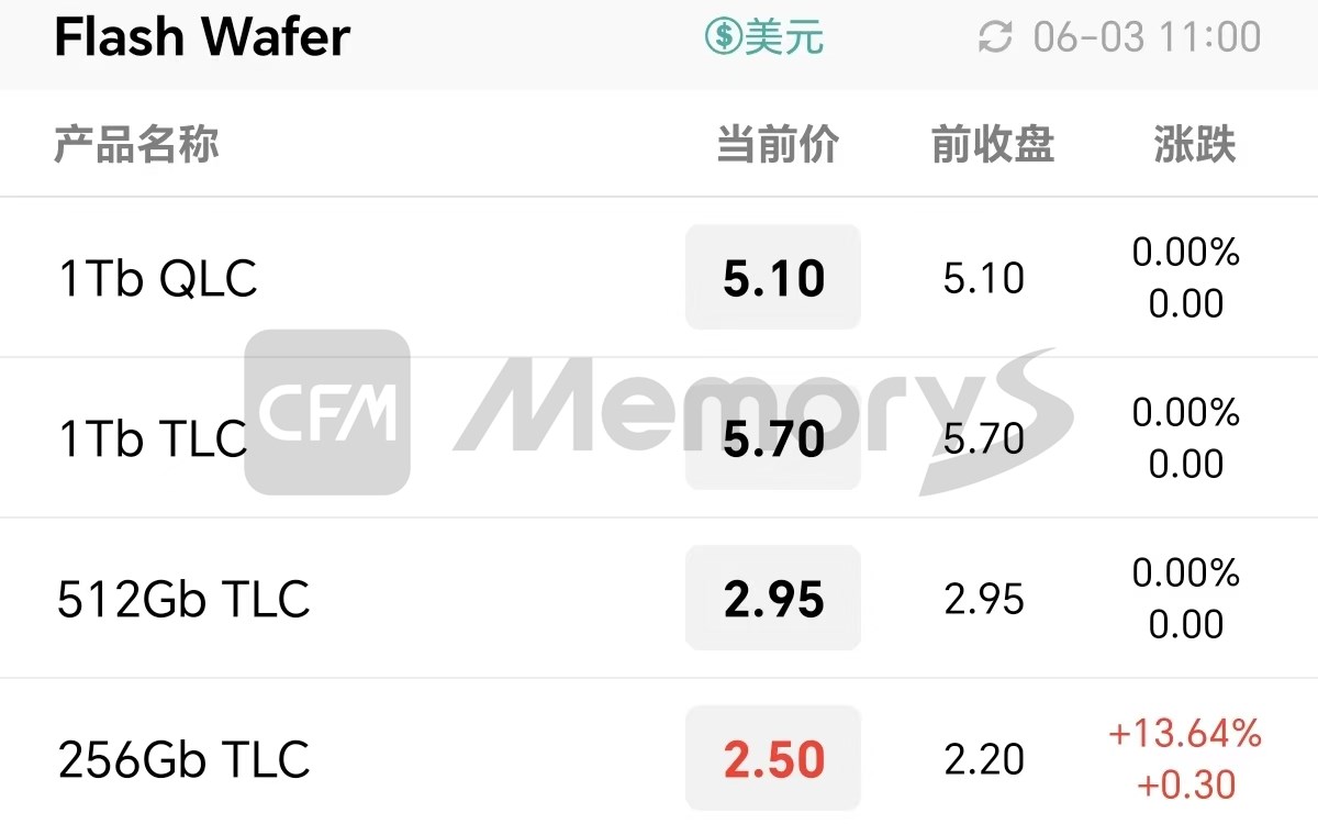 上游资源方面,DDR资源价格暂时不变,个别NAND Flash Wafer价格大幅上涨。其中,256Gb TLC NAND Flash Wafer价格调整至2.5美元,1Tb QLC/1Tb TLC/512Gb TLC NAND Flash Wafer分别维持在5.10/5.70/2.95美元。