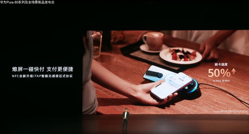 值得注意的是,在发布会上,华为常务董事、终端BG董事长余承东宣布,Pura 80手机NFC全新升级iTAP智能无感接近式协议,熄屏一碰快付,支付更便捷,刷卡速度较Pura 70 Pro+提升50%。HUAWEI WATCH 5同样支持熄屏支付,无需点亮屏幕,抬腕即可开始支付。