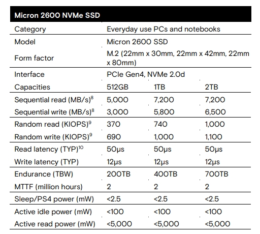 美光2600 NVMe SSD提供 22x30mm、22x42mm 和 22x80mm 三种规格,容量提供512GB 到 2TB多种选择。