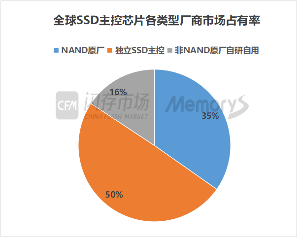 按照厂商类型来看,2024年原厂自研自用SSD主控约1.35亿颗,在全球SSD主控市场中占比约35%;非NAND原厂自研自用SSD主控约6100万颗,在全球SSD主控市场中占比约16%;独立第三方主控厂商SSD主控出货量约1.925亿颗,在全球SSD主控市场中占比约50%,相较2023年增长13.3%。