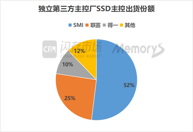 其中,就独立第三方主控厂商来看,CFM闪存市场数据显示,2024年SMI慧荣科技SSD主控出货量约1亿颗,占比约52%;联芸SSD主控出货量约4900万,占比约25%;得一微电子SSD主控出货量约2000万,占比约10%;其他厂商合计占比约12%。