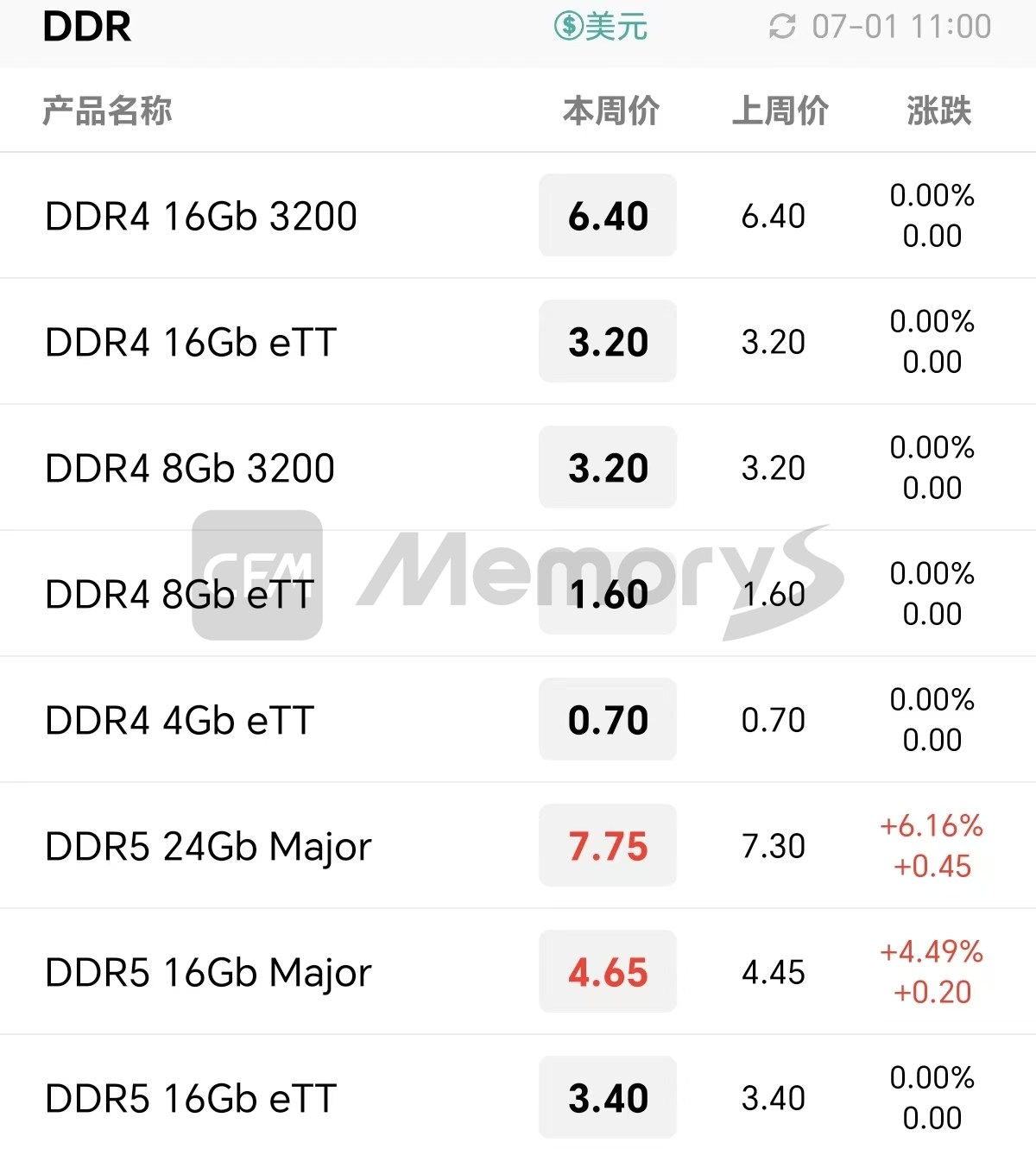 上游资源方面,今日Flash Wafer价格变动不大,部分DDR5颗粒小幅上涨,DDR4颗粒暂时持平。其中,其中,DDR5 16Gb Major/24Gb Major调涨至4.65/7.75美元。