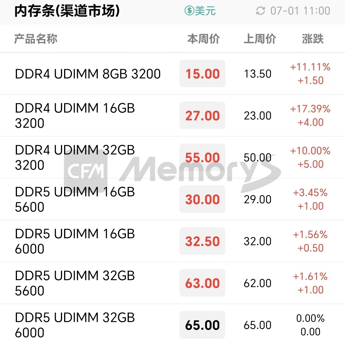 渠道市场内存条最新报价