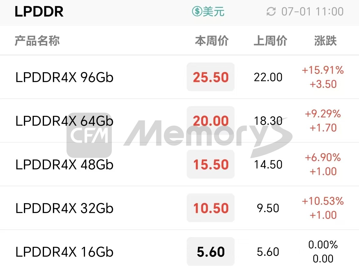 近期,封装基板等关键材料缺货持续发酵并传导至成品端,使本就受存储资源供应紧缺影响的LPDDR4X成品产出更加艰难,尤其8/16Gb等低容量LPDDR4X交付压力更为突出,带动LPDDR4X产品价格延续攀升态势。相关集成式eMCP和uMCP产品跟随LPDDR4X价格上扬调涨报价。