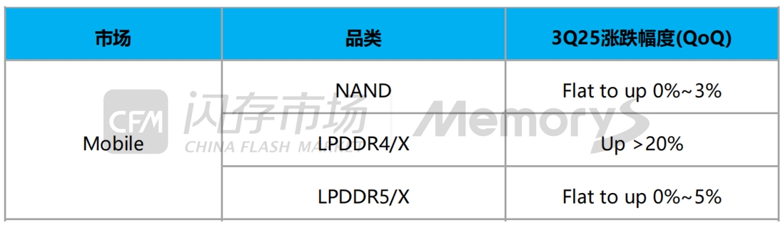 CFM闪存市场近日发布2025年Q3存储市场展望报告。报告指出,预计三季度,原厂Mobile NAND ASP以持平至低个位数上涨为主,LPDDR4X环比大幅上涨20%以上,LPDDR5X预计将出现中低个位数小幅上涨。