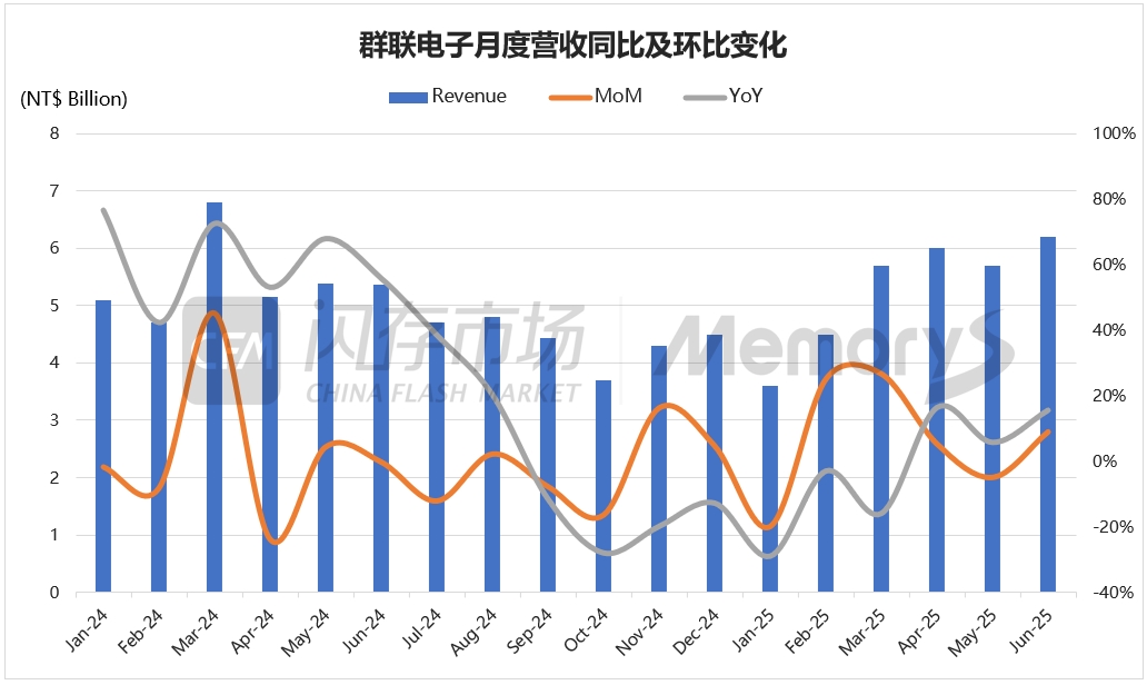 群联电子6月营收61.98亿元(新台币,下同),环比增长8.93%,同比增长15.61%,为历年第三高纪录;第二季营收178.9亿元,环比增长29.28%、同比增长12.55%,创历史新高;累计上半年营收317.29亿元,同比减少2.13%。