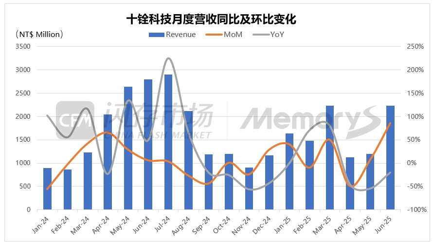 存储模组厂十铨科技6月营收22.34亿元(新台币,下同),环比增长85.97%,同比减少20%;累计1-6月营收99.2亿元,同比减少5.3%。