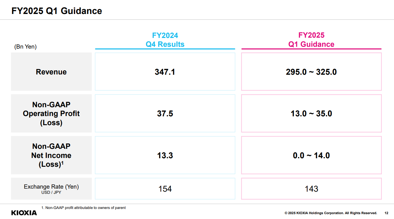 铠侠预计FY25Q1(4-6月)收入和利润将较前季环比下降。其中,营业收入将在2950亿日元至3250亿日元区间,Non-GAAP营业利润将在130亿至350亿日元之间,Non-GAAP净利润预计在0亿至140亿日元之间。