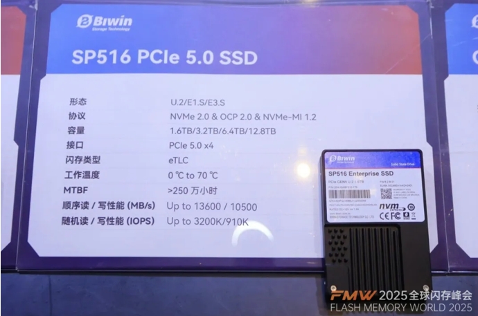 其中,SP5系列产品采用PCIe 5.0x4接口,2.5" U.2外形设计,提供高达13,600MB/s的顺序读取速度和10,500MB/s的顺序写入速度,4K随机读取/写入性能最高可达3200K IOPS/910K IOPS,展现出极高的吞吐能力和响应效率。此外,其采用的创新架构设计,使单位功耗下的KIOPS/Watt综合性能处于行业领先水平,为绿色数据中心建设提供了有力支撑。