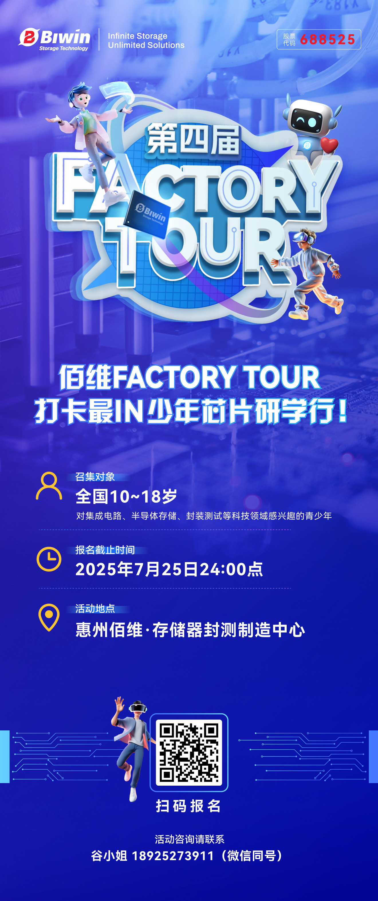 第四届佰维存储 FACTORY TOUR 如约而至,佰维存储诚邀您一起走进半导体的世界,共赴这场属于青春与科技的盛会,见证“芯”时代的每一次跃升!
