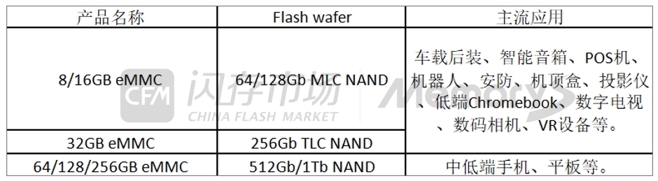目前,32GB及以下容量的eMMC产品应用较为分化,下游覆盖车载后装、智能音箱、POS机、机器人、机顶盒、投影仪、TV、VR设备等多个领域,尽管部分高端型号对于64GB及以上容量也有部署,但32GB及以下容量的eMMC仍占据重要市场份额。