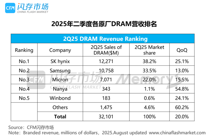 美光二季度(2025年3月-5月)DRAM销售收入达70.71亿美元,环比增长15.5%,市场份额22%,排名第三;