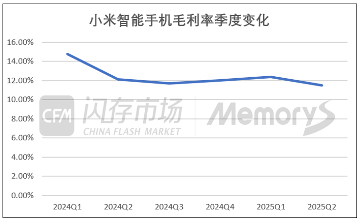 值得注意的是,二季度小米智能手机毛利率为11.5%,相比一季度有明显下滑。一方面是由于小米在中国大陆的618电商购物节期间增强了促销力度,以及境外市场竞争加剧及毛利率较低的产品收入占比增加所致。另一方面,小米集团合伙人兼总裁卢伟冰在财报电话会议表示,手机成本上升也是导致毛利率下降的另一重要因素,而造成手机制造成本上涨的其中一个关键因素就是存储芯片的上涨。卢伟冰表示内存价格的上涨比原来预期要高得多,尤其是LPDDR4X,原来关注度基本上都放在LPDDR5X上,但LPDDR4X的增速反而是最高的,这对中低端产品的影响还是比较大的。细看小米今年发布的几款手机新品,REDMI A5、Redmi 14C 5G(海外版)等低端机型的存储配置均采用LPDDR4X分离式方案。