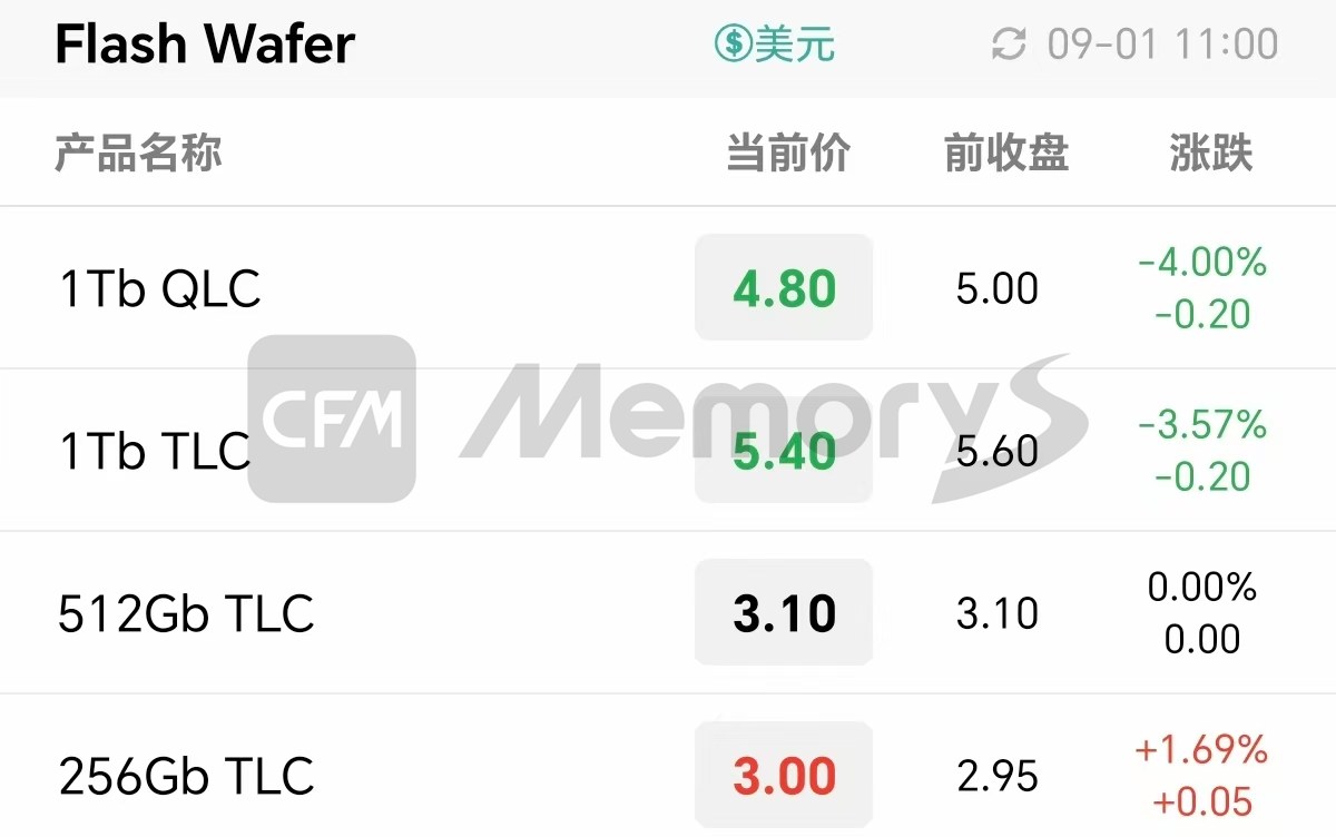 据CFM闪存市场最新报价,1Tb TLC报价跌3.57%至$5.4 ,1Tb QLC报价跌4%至$4.8,256Gb TLC报价涨1.69%至$3.0。