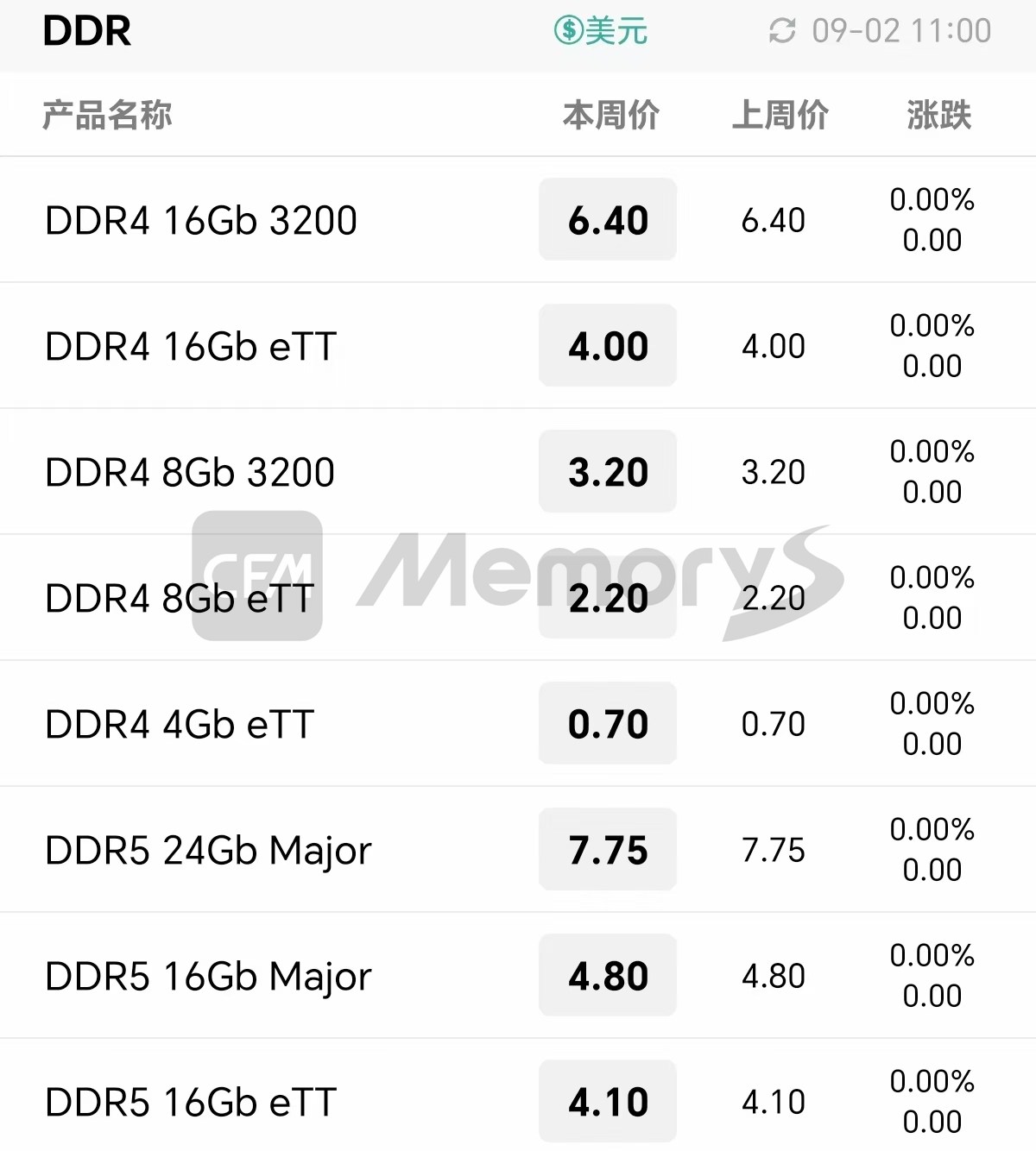 具体来看,近日256Gb TLC Flash Wafer价格小幅上涨至3.00美元,而1Tb QLC Flash Wafer、1Tb TLC Flash Wafer分别向下调整至5.40/4.80美元。512Gb TLC Flash Wafer价格保持稳定。DDR4、DDR5颗粒价格维持不变。